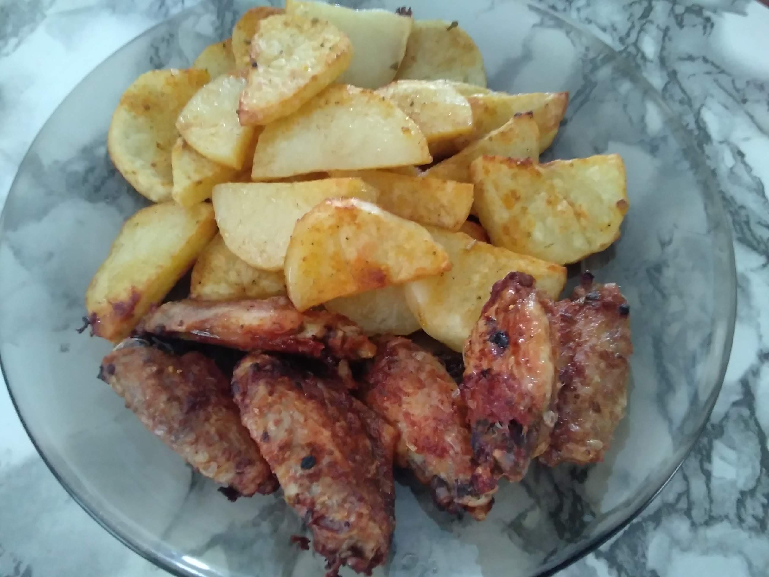 Szombat: Tojásos leves, fűszeres csirkeszárnyközép és tepsis krumpli, ill. sültkrumpli